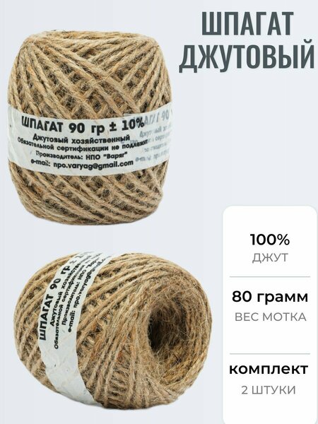 Шпагат джутовый, натуральный, для вязания, дачи, декора, 65 метров. Комплект 2 штуки. Изготовлен из отборного волокна джута, скрученного в тонкие пряди. Широко применяется для бытовых и хозяйственных нужд, подвязки растений и деревьев, упаковки товаров, в том числе пищевых продуктов, для творчества и рукоделия, для строительных и ремонтных работ. Благодаря своим уникальным природным свойствам и высокой практичности джутовый шпагат является незаменимым помощником в каждом доме и дачном хозяйстве.