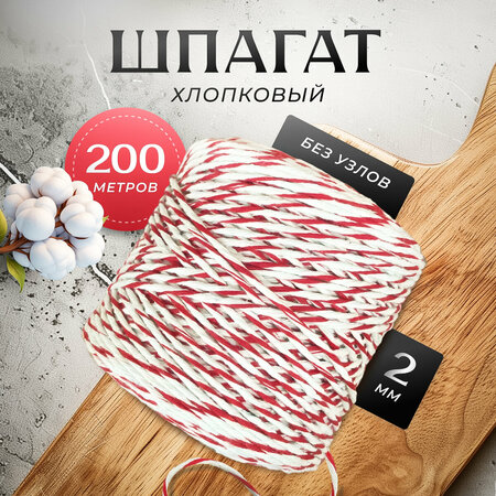 Шпагат хлопковый Dolly Hobby, цвет бело-красный. Хлопковый шапагат бело-красного цвета, с небольшой примесью полиэфира (для увеличения прочности), мягкий и очень приятный на ощупь. Изготовлен из одной пряди методом скручивания. Диаметр ~ 2мм. Длина 200 метров (+-6%) Отлично подходит для рукоделия, плетения в разных техниках. Часто используется как упаковочная веревка - для новогодних подарков, подарков на день рождения и перевязывания чего угодно. Используют шпагат в кулинарных целях: для запекания и копчения мяса, рыбы, сыров, а также при заморозке полуфабрикатов для придания им нужной формы. Нить используют в домашней кулинарии, а также на промышленном производстве колбас, сосисок, мясных и рыбных деликатесов. Ещё 1 применение - подвязка растений - помидор, огурцов, гороха и прочих с/х культур. Кроме того, наш шпагат из-за наличия синтетических волокон устойчив к воздействию влаги, солнечного света и других внешних факторов, что делает ее идеальным выбором для использования в хозяйстве по дому и на улице.