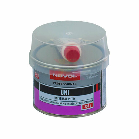 Универсальная полиэфирная заполняющая автомобильная шпатлевка Novol Uni Universal Putty, относительно прочная и с небольшой эластичностью, рекомендуемая в основном для механической обработки, а также для применения на небольших поверхностях или для небольших ремонтов. Хорошо наносится тонкими слоями шпателем и заполняет мелкие неровности и царапины. Материал обладает прекрасной адгезией к разным видам оснований, в том числе к стали, алюминию, полиэфирным ламинатам, акриловым грунтам и старому ЛКП, также широко применяется при малярных и отделочных работах по дереву, бетону и пластмассе. Не наносить непосредственно на реактивные грунты. Воздушная сушка при 20 °С. около 20-30 минут, температурная сушка при 60 °С. около 10 минут. Пропорция смешивания с отвердителем 2-3%. Смешивать с отвердителем малыми частями непосредственно перед нанесением, время жизни готовой смеси (при смешивании с отвердителем) около 4-6 минут при 20°С. Минимальная температура нанесения +10 °С. Шпатлевка поставляется в комплекте с отвердителем. Шпатлевка Novol Uni - незаменимый высококачественный продукт для быстрого профессионального автомобильного ремонта, а также при бытовом ремонте вещей.
