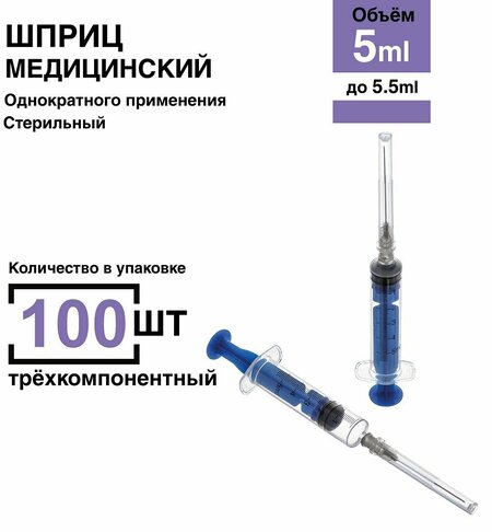 *Шприц медицинский одноразовый инъекционный стерильный 5 мл, с иглой 22G 0,7*40 *Шприцы поставляются напрямую от производителя, остаточный срок годности не менее 4 лет. *Шприц одноразовый медицинский 3-х компонентный состоит из: прозрачного цилиндра, поршня и резиновой манжеты на поршне (3-й компонент шприца), которая обеспечивает плавность ввода лекарственных средств. *Цилиндр обладает повышенной прозрачностью для обеспечения максимального контроля наличия пузырьков воздуха и дозы вводимого препарата, обработан специальным медицинским, гипоаллергенным силиконом, для обеспечения плавного хода поршня. *Плавный ход поршня обеспечивает безболезненную инъекцию. *Шкала имеет расширенную градуировку до 5,5 мл для ведения дозы больше номинального объема шприца *Тонкостенная игла из медицинской стали марки SUS304 с исключительно гладкой поверхностью. Заточка иглы лазерная трехгранная копьевидная. *Стопорное кольцо исключает риск случайного извлечения поршня из цилиндра. *Соединение типа LUER, игла насажена на конус цилиндра. *Упаковка - полиэтиленовый пакет (РЕ). *В упаковке 100 штук, цена указана за упаковку