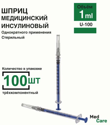 *Шприц медицинский одноразовый инъекционный стерильный объемом 1 мл, трехдетальный, иглой 0,4х12 (27G). Игла надета, съемная. Двойная шкала позволяет использовать шприц, как для введения инсулина, так и туберкулина. Шкалы: - инсулиновая – 100 единиц (соответствует 1 мл), цена деления 1 единица - туберкулиновая – 1 мл, цена деления 0,01 мл. *Игла надета на шприц. Детали шприца изготовлены из полиэтилена и полипропилена медицинского назначения; манжета изготавливается из нетоксичного резинового компаунда, не содержащего латекс, что позволяет исключить проявление часто встречающейся латексной аллергии. *Индивидуальная упаковка позволяет идентифицировать шприц без вскрытия упаковки. Бесцветный прозрачный цилиндр и синий контрастный шток-поршень для лучшего визуального контроля лекарства при проведении процедуры. Внутренняя поверхность цилиндра обработана специальным составом, что обеспечивает плавный и мягкий ход поршня. *Стопорные кольца внутри цилиндра предотвращают выдергивание поршня даже при значительном усилии. Инъекционная игла с трехгранной заточкой 0,4х12 (27G) является тонкостенной, а, следовательно, менее травматичной; заточка иглы под наиболее оптимальными углами делает колющую часть иглы наиболее острой; специальное покрытие позволяет значительно снизить сопротивление при вхождении иглы в ткань. *Индивидуальная потребительская упаковка "блистер" - сверху полиэтилен, снизу медицинская бумага (для выхода токсичных газов). Упаковка легко вскрывается без образования бумажной бахромы, отражает полную информацию о продукте: № партии, дату окончания срока годности, данные о производителе. *Стерилизация газовая – оксидом этилена. Срок годности не менее 4 лет. *Конический поршень для введения точной дозы препарата. Несмываемая двойная шкала 1 мл/100 ед. Стерильный Одноразовый Инсулиновая шкала 100 ед, цена деления 1 ед. Туберкулиновая шкала 1 мл, цена деления 0.01 мл. Игла G27 (0.4х12 мм)