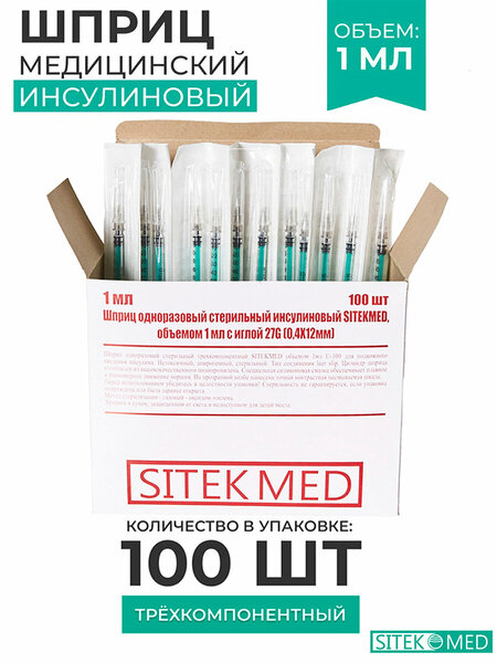 Ищете надежные и удобные медицинские шприцы для проведения инъекций? Наш медицинский набор инсулиновых шприцев - идеальное решение для вас! Данный набор включает целых 100 штук одноразовых трехкомпонентных шприцев, каждый из которых оснащен иглой. Модифицированный упор для пальцев, имеющий выраженную ребристость, позволяет надежно удерживать шприц во время инъекции. Разъем luer-slip исключает размыкание шприц-игла. Особая форма резинового уплотнителя, благодаря идеальному положению на дне цилиндра, гарантирует введение полного объема лекарства. Предназначен для подкожных, внутримышечных и внутривенных инъекций. Нетоксичный, апирогенный, стерильный. Шприцы имеют вместительность от 1 мл, что обеспечивает достаточную емкость для процедур по введению инсулина. Благодаря своему удобному размеру, они легко помещаются в аптечку или контейнер для инъекций и удобны в использовании как в медицинских учреждениях, так и в домашних условиях. Наш набор шприцев предлагает непревзойденную комбинацию качества и безопасности. Каждый шприц изготовлен из высококачественных материалов, что гарантирует их прочность и надежность. Игла, встроенная в каждый шприц, обеспечивает точность и комфорт при проведении инъекций, снижая риск повреждения тканей. Шприцы SITEKMED идеально подходят для широкого спектра медицинских процедур, включая инъекции лекарств, внутримышечные и подкожные инъекции, а также для сбора проб крови и других биологических жидкостей. Независимо от того, являетесь ли вы медицинским профессионалом или просто нуждаетесь в качественных шприцах для домашнего пользования, наш набор шприцев удовлетворит все ваши потребности. Важно отметить, что наши медицинские шприцы одноразовые, что означает, что их можно использовать только один раз. Это гарантирует максимальную гигиену и предотвращает возможность повторного использования, что особенно важно для предотвращения инфекций и перекрестного заражения. Не рискуйте своим здоровьем и безопасностью - выбирайте надежные и профессиональные медицинские шприцы. Закажите наш набор шприцев прямо сейчас и обеспечьте себе и своим близким оптимальную защиту, комфорт и уверенность при проведении инъекций. ! Перед использованием убедитесь в целостности упаковки.