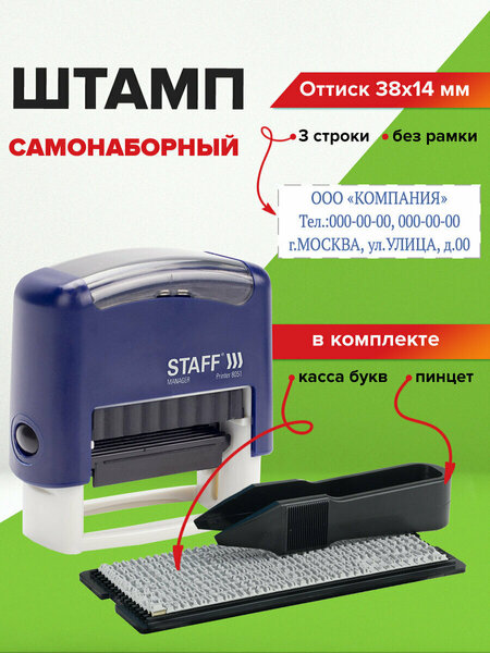 Самонаборный штамп STAFF "Printer 8051" — незаменимый инструмент для вашего офиса. Этот штамп позволяет создавать индивидуальные оттиски, экономя ваше рабочее время и обеспечивая точность всех необходимых отметок на документах. Синяя печать размером 38х14 мм вмещает до 3 строк текста, что позволяет вам варьировать содержимое по ситуации. Корпус штампа выполнен из прочного пластика и оснащен надежными фиксаторами, удерживающими подвижную часть штампа в положении. Верхняя часть корпуса имеет специальное прозрачное окно для удобной идентификации образца текста. Легкая замена штемпельной подушки и пожизненная гарантия на механизм делают штамп самонаборный STAFF "Printer 8051" долговечным и удобным в использовании. В комплект входят касса русских букв, цифр и символов, оснастка, штемпельная подушка и пинцет, что делает этот штамп идеальным для оформления любых документов. Используйте его как штамп, датер или печать канцелярскую, и ваши документы всегда будут надлежащим образом оформлены. Выбирая штампы и печати STAFF, вы получаете надежность и качество на долгие годы. • Максимальное количество строк: 3. • Серия: Stamp. • Длина оттиска: 38 мм. • Ширина оттиска: 14 мм. • Максимальный размер шрифта кассы: 3.1 мм. • Минимальный размер шрифта кассы: 2.2 мм. • Максимальное количество строчных букв в строке: 22 шт. • Максимальное количество прописных букв в строке: 15 шт. • Материал: пластик. • В комплекте: касса шрифта, пинцет, сменная подушка. • Цвет оттиска: синий. • Цвет корпуса: темно-синий. • Тип упаковки: блистер с европодвесом. • Артикул производителя: 237423.