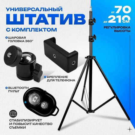 Универсальный металлический трипод с держателем для телефона, шаровой головкой и Bluetooth пультом управления представляет собой надежный и инновационный инструмент для профессиональных фото- и видеосъемок. Подставка для телефона с регулируемыми ножками изготовлена из высококачественного металла, что обеспечивает устойчивую и надежную поддержку различных устройств и удобно разместит вашу камеру или смартфон на неровной поверхности, создавая стабильное основание для идеального кадра. Удобная шаровая головка с резьбой 1/4 ", обеспечивает быструю и точную регулировку угла наклона и поворота для лучшего ракурса. Благодаря Bluetooth пульту управления вы сможете легко управлять вашим устройством даже на расстоянии, что делает процесс съемки еще более комфортным. Этот универсальный монопод может регулироваться по высоте от 70 до 210 см, что делает его идеальным для различных видов съемок и сценариев. Улучшите качество своего контента и сделайте свои проекты более профессиональными с помощью этого штатива. Особенности: · Шаровая головка с резьбой 1/4 ', для универсального использования. · Качественный сплав, устойчивый и прочный. · Регулируемая высота, идеально подходит для портретной и большой фотографии. · Практичный, универсальный, компактный, простой в использовании. · 3-секционная центральная стойка и простая регулировка высоты. · Резиновые ножки обеспечивают дополнительный захват. · Подходит для: · Поддержка студийных огней, вспышки, зонта, отражателя и т. д. Технические характеристики: · Диаметр кронштейна: прибл. 23 мм. · Рабочая высота: 80 см -200 см. · Цвет: черный