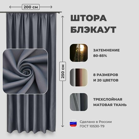 Штора для комнаты 200x250 см Блэкаут однотонный матовый Shtoraland на ленте для крючков, одна портьера для гостиной, спальни, детской. Графитовый цвет