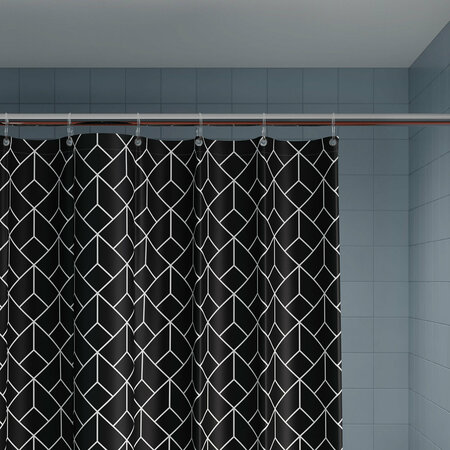 Текстильная штора для ванной черного цвета с белым геометричным принтом в стиле ар-деко. • Изготовлена из износостойкого полиэстера с усиленной водонепроницаемой пропиткой. При попадании на ткань вода не впитывается, а скатывается каплями, даже при сильном напоре воды. • В комплекте 12 колец С-формы из прозрачного пластика. • По верхнему краю расположены 12 прозрачных пластиковых люверсов. • Штора имеет утяжеляющую нить по нижнему краю, которая позволяет избежать задирания ткани. • Легко ухаживать: шторку для ванной комнаты можно стирать в стиральной машине в деликатном режиме и гладить утюгом на минимальной температуре. Гарантия на текстильные аксессуары IDDIS® – 1 год.