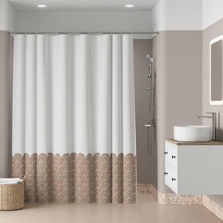 Текстильная штора для ванной белого цвета с карамельно-коричневым принтом в виде волн в средиземноморском стиле. Штора освежит пространство и привнесет в него легкое настроение. • Изготовлена из износостойкого полиэстера с водоотталкивающей пропиткой. При попадании на ткань вода не впитывается, а скатывается каплями, даже при сильном напоре воды. • В комплекте 12 колец С-формы из прозрачного пластика. • По верхнему краю расположены 12 прозрачных пластиковых люверсов. • Штора имеет утяжеляющую нить по нижнему краю, которая позволяет избежать задирания ткани. • Легко ухаживать: шторку для ванной комнаты можно стирать в стиральной машине в деликатном режиме и гладить утюгом на минимальной температуре. Гарантия на текстильные аксессуары IDDIS® – 1 год.