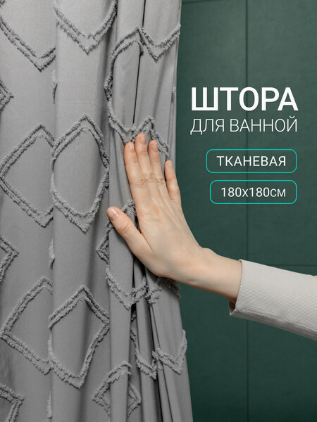 Штора для ванны CozyBathroom, "Ромбы", тканевая, с подхватом, с рюшами, для ванной комнаты, серый, 180x180 см