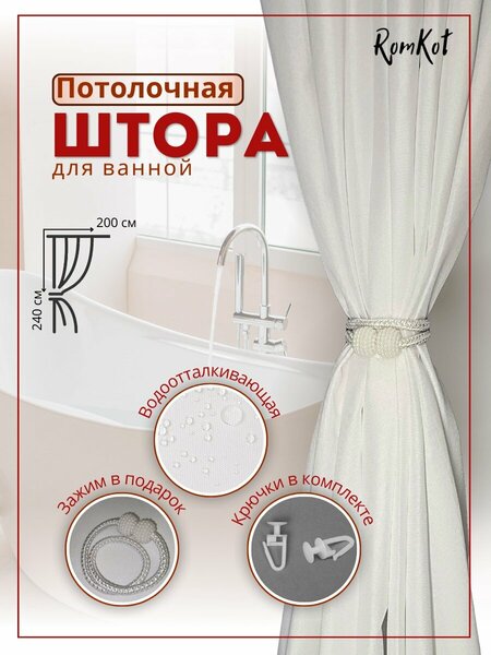 Представляем вашему вниманию потолочную штору для ванной и душа Премиум 200/240. Эта штора станет отличным решением для обеспечения уединения и защиты от брызг в ванной комнате. Изготовленная из качественной непрозрачной тканей, она эффективно защищает от посторонних взглядов и создает уютную атмосферу во время принятия душа. Она предназначена для использования в скрытом потолочном карнизе, что существенно облегчи Вам поиск шторок и не придется приводить их в надлежащий для использования вид. В комплект сразу входят крючки, вшита шторная лента. Наши шторки предназначены для людей, которые исключили из использования в ванной комнате штанги. Штора оснащена утяжелителем по нижнему краю, что обеспечивает ей стабильность и предотвращает нежелательное поднимание краёв, даже при сильном потоке воздуха. Благодаря этому, вы можете быть уверены в том, что штора останется на месте и не будет мешать вашему комфорту. Легкий уход и прочные материалы гарантируют долгий срок службы изделия. Эта потолочная штора идеально подойдет для любых стилей интерьера, благодаря своему простому, но стильному дизайну. Она станет не только практичным, но и эстетичным элементом в вашем помещении. Установка шторы не требует специальных навыков и занимает минимальное время, что делает ее удобным выбором для обновления вашего пространства.