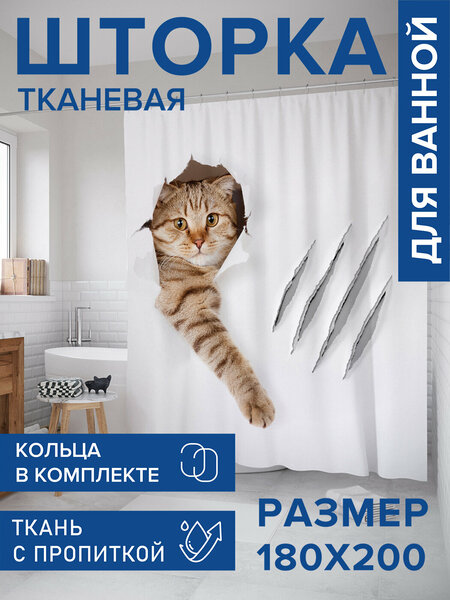 Штора в ванную тканевая с водоотталкивающей пропиткой / занавеска в душевую с рисунком "Кот с царапиной", 180х200 , JoyArty