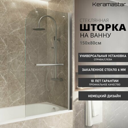 Шторка для ванны прозрачная Keramastar Supra KR065031 (150х80) стекло 6мм. • Петли: подъемная цилиндрическая петля. • Конструкция дверей: распашная наружу и во внутрь. • Исполнение полотна двери: прозрачное. • Толщина полотна двери, мм: 6. • Монтаж: к стене на ванну. • Оснащение: полотенцедержатель Бренд Keramastar cтанет украшением вашего дизайна. Современные технологии производства и качественные материалы, используемые для изготовления уголка, позволят долгие годы радовать вас внешним видом. Продуманный дизайн и необычные стилистические решения помогут создать неповторимый интерьер ванной комнаты, при этом широкий ассортимент позволит подобрать модель на любой вкус и кошелек. Созданные полностью из безопасных и экологически чистых материалов, они соответствуют международным стандартам качества, что подтверждается многочисленными сертификатами.