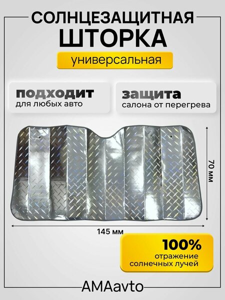 Большой солнцезащитный экран на лобовое стекло светоотражающий двухсторонний Штора имеет стандартный вырез для зеркала заднего вида и подходит на большинство современных автомобилей. В качестве материала используется Foam - комбинированный 2-слойный материал: алюминиевая фольга и специальный вспененный материал (1,5 мм). На стекло шторка крепится с помощью идущих в комплекте мощных присосок. Двусторонняя солнцезащитная шторка обеспечивает надежную защиту от нагревания салона транспортного средства что делает вождение комфортным. Они подходят для любого типа транспорта легко устанавливаются и не требуют специальных крепежей а снимаются не оставляя ни каких следов и эффективно защищают от солнечного света. Вы можете больше не тратить время на поиск парковочного места в тени так как ваш автомобиль находится под надежной защитой. Разместив шторки на лобовом боковом или заднем стекле вы предостережете приборную панель и предметы в вашем автомобиле от перегрева. А так же солнцезащитная шторка-экран на окно для помещений 145 на 70 см идеально подходит для защиты от солнца солнечных лучей в квартире на даче на балконе на лоджии крепится надежными присосками с внутренней стороны окна и создается эффект ночи, что очень актуально в летнее время когда солнце солнечные лучи проникают в квартиру очень рано и мешают спать. Штора изготовлена из специального фольгированного материала с воздушной прослойкой и зеркальной поверхностью. Благодаря высокой степени термоизоляции и светоотражающих свойств материала, внешняя температура не допускается в помещение, потому, можно использовать ее в качестве жалюзи на окна. Эффект термоса позволяет поддерживать в помещении комфортную температуру. Шторка защищает не только от прямых солнечных лучей, но и позволяет намного лучше сохранить прохладу и сократить расход электроэнергии на охлаждение помещения. В углах шторки встроены люверсы, через которые легко крепится на держатели-присоски. Жалюзи на окна, штора для окна, имеет презентабельный вид и будет актуальна для любого интерьера помещения. Солнцезащитная шторка для автомобиля. шторка солнцезащитная автомобильная. шторка автомобильная автошторка от солнца.
