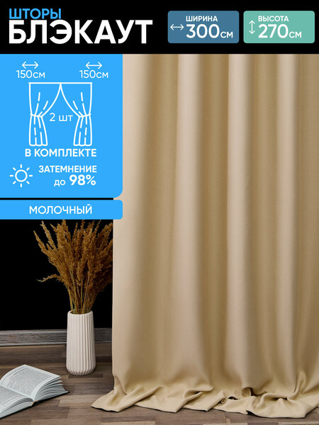 Шторы блэкаут в спальню и гостиную длинные плотностью 270 гр/м. Комплект из двух штор 150х270- общая ширина три метра бежевого цвета вызывают чувство безопасности, благополучия и комфорта. Портьеры на шторной ленте шириной 6 см можно повесить тремя способами: на карниз, трубу и на классическую гардину с помощью крючков или колец. Шторную ленту можно стягивать, создавая красивую драпировку и регулировать этим ширину портьеры. Ткань- полиэстер, плотная устойчива к выгоранию, не садиться, не меняет цвет после стирки. Портьера из ткани для штор блекаут затемнение до 80%. Шторы блекаут не мнутся и не деформируются. Уход за изделием: Стирка на деликатном либо ручном режиме, при t до 30 градусов. Температура глажки 60-80 градусов. Допустимо отпаривание. Способ крепления: снимите крючки с гардины или карниза, достаточно 10-15 крючков на 1 штору; проденьте крючки в отверстия на шторной ленте с внутренней стороны; завяжите узкие веревочки по краям шторной ленты, чтобы они не вылетели и не запутались и проденьте крючок на карниз или гардину. При желании затяните их для красивой драпировки, специально чтобы шторы стали с красивыми изгибами. Идеальный интерьер загородного дома или дачи не может быть без длинных, плотных штор. Шторы для гостиной - это красивый элемент для любого времени года: зима, лето или демисезон: весна и осень, минимализм в дизайне с нотками изысканности и вкуса. Прекрасно сочетается практически со всеми остальными цветами. Актуальные и стильные занавески беж способны сделать акцент в декоре комнаты задав нужный тон. Они не только не пропускают солнечные лучи, но и скрывают ваше жилище от посторонних взглядов. Универсальные, светонепроницаемые портьеры блэкаут отличное решение для зала или гостиной в квартиру. Многофункциональность позволит вам повесить модный аксессуар занавесь не только возле подоконника, а использовать для зонирования помещения. Шторы затемнения подходят для детского сада, школы в актовый зал или кафе, ночного бара и клуба. Светоотражающий материал устроит комфорт в детской спальне. Блэкаут шторы обладают звукоизоляционными свойствами, благодаря шторам ребенок без проблем ляжет на дневной отдых. А современные технологии по производству изделия экологичны, они придают практичность, долговечность и износостойкость. Приятная на ощупь портьерная ткань блэк аут обеспечивает дополнительную защиту от яркого света, достигая эффекта свето-поглощения. Теперь на вашей лоджии или балконе не будет видны блики от искусственного источника: уличные фонари, фары машины и автомобилей и рекламных баннеров, что позволит создать особая обстановку с уютной атмосферой. В таком помещении удобно работать не отвлекаясь на мелочи. Шторы блекаут помогают сохранять прохладу в летнее время и тепло в зимний сезон. Шторы могут сочетаться с различными стилями мебели: современную и классическую или восточную. Бежевый — это беспроигрышный вариант, когда хочется создать максимально простую, изысканную и гостеприимную атмосферу. Вне зависимости от того, какой именно стиль будет выбран, преобладание бежевого цвета всегда смотрится очень эффектно. Важно! Цветовосприятие у всех разное - ориентируйтесь на свои предпочтения! Способы применения: 1)Склад за шторой. 2)Шторы на террасе. 3)занавески в качестве декора дома – повесить их за кров