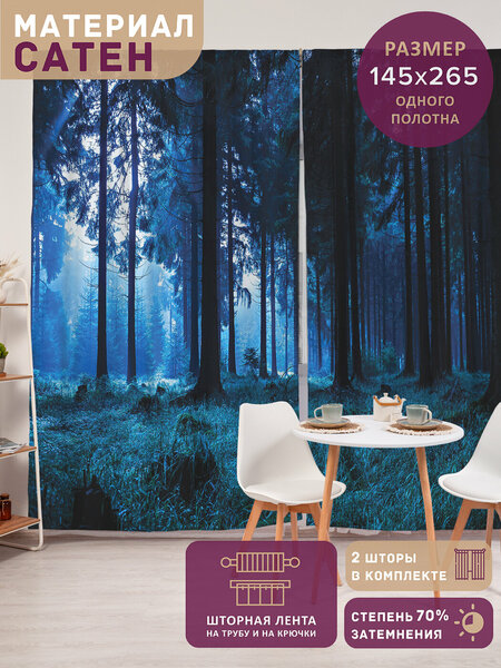 Комплект длинных штор (2 полотна) по 145х265 см изготовлены из приятного на ощупь материала "Сатен" плотностью 175 гр./кв. м (100% полиэстер). Крючки (50 шт.) идут в подарок! Шторную ленту шириной 6 см можно также повесить на карниз, гардину или трубу. Оборотная сторона фотоштор - белая. Изделие можно стирать при температуре 30-40 градусов, выбирая деликатный режим стирки. Фотошторы подходят для использования в зимний и летний период. Портьеры пропускают около 30% дневного света (не блекаут). Яркость рисунка может отличаться от изображения на сайте. Допустимо отклонение в размерах +- 5 см.