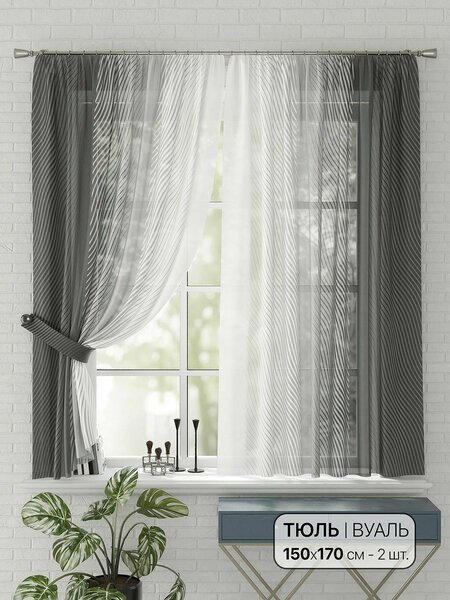 Легкая основа вуаль оформлена принтом без подхватов. Вуаль с матовой полупрозрачной текстурой. Отличается особым шиком, идеально подходит для создания воздушных штор. Придает ощущение свежести, хорошо пропускает воздух. Ткань неприхотлива в уходе, хорошо стирается без разрушения волокон с течением времени за счет высокого кручения нитей. Ширина одного тюля без сборки 150 см, высота 170 см. По верхнему краю тюля пришита шторная тесьма 6 см, с ее помощью затянув узелки от кордовых нитей с обеих сторон и стянув их до нужного размера можно сформировать округлые складки, далее вставить крючки в кармашки и повесить на карниз. Обязательно проверьте кордовые нити – они должны быть надежно завязаны, в противном случае во время стягивания они могут вылететь. Шторная тесьма имеет два ряда кармашков, с их помощью можно регулировать не только длину, но и ширину. Такое крепление подходит для всех типов карнизов.