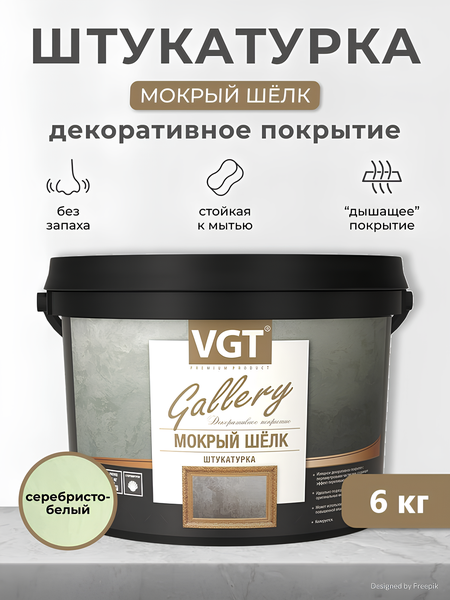 VGT ДЕКОРАТИВНАЯ ФАКТУРНАЯ ШТУКАТУРКА "МОКРЫЙ ШЁЛК",СЕРЕБРИСТО-БЕЛАЯ №1 ,6 кг
