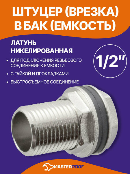 Штуцер (врезка) в бак (емкость) с прокладкой 1/2", латунь Штуцер (врезка) в бак с прокладками предназначен для соединения резьбовых фитингов и устройств с корпусом емкости из любого материала (к примеру пластиковой, или металлической бочки). За счет гайки и прокладок создает герметичное соединение. В конструкции предусмотрены выемки под ключ для американок. Характеристики Тип резьбы: наружная, 1/2". Материал: никелированная латунь. Страна производства: Китай.