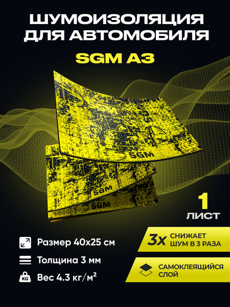 Компания SGM является официальным производителем и поставщиком товаров для шумо и виброизоляции автомобилей. Наша продукция отличается высоким качеством материалов и широким ассортиментом выбора товаров для автомобилей различного типа. С нашей шумоизоляцией для автомобиля SGM А3 ваша машина значительно преобразится. Набор для автомобиля: размер листа – 0.4х0.25м. Толщина – 3мм. Количество листов в упаковке (коробка) 1 шт. SGM А- уникальная система шумоизоляции в автомобиле обладающая высокой звукоизоляцией, которая выступает гарантом защиты кузова от коррозии. Алюминиевая фольга толщиной 100 мкм с полимерной самоклеющейся композицией, в качестве которой выступает мастика. C монтажной стороны материал защищен силиконизированной бумагой. Предназначен к использованию в автомобильной индустрии для демпфирования незначительных вибраций. Вибродемпфер М3 устанавливается на капот, пол салона, арки, тоннель, двери, крыша салона, багажник, крышка багажника, перегородка моторного отсека со стороны салона авто. А также используют для разного рода автомобильного пластика - дверная обивка, стойки, пластиковый локер. Шумоизоляционные листы М3 можно монтировать на подкрылки со стороны арок, арки автомобиля, отлично подойдут для защиты картера. Рабочий диапазон температур позволяет использовать вибродемпфер от -40С до +120С. Размерность листа: 0.4 х 0.25 (м.). КМП: 0,40. Подготовка акустической системы автомобиля начинается с правильно подобранной виброизоляции. Полезные автотовары для звукоизоляции в вашей машине. Монтаж шумоизоляции SGM А3: 1. Перед установкой звукоизоляционного материала SGM тщательно очистите и обезжирьте поверхность - она должна быть сухой и чистой. 2. Не снимая защитной пленки, приложите лист материала к поверхности, которую хотите звукоизолировать. Убедитесь, что звукопоглощающий материал полностью покрывает поверхность данного элемента. 3. Осторожно снимите защитную пленку и прикрепите лист материала к рабочей поверхности. Тщательно разгладьте его руками, чтобы удалить все пузырьки воздуха снизу. 4. Обработайте материал валиком, чтобы разгладить текстуру фольги. Выравнивайте поверхность материала до тех пор, пока она не станет плоской и гладкой. Альфа, Alfa