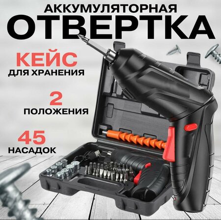Набор включает в себя аккумуляторную отвертку и набор бит в ударопрочном кейсе. Отвертка состоит из мощного двигателя, металлического редуктора и объемного аккумулятора. Быстрый тормоз крутящего вала обеспечивает точность работы и возможность реверсивного вращения. Количество бит в наборе -30 шт плюс 15 шт дополнительных насадок, для работы с плоскими и крестовыми винтами, торцевыми гайками, а также другими типами крепежных элементов. Торцевые головки размером от 5 мм до 12 мм. Материал бит -особо прочная сталь S2. Держатель бит- магнитный. Гибкий удлиненный вал позволяет работать даже в самых труднодоступных местах - угловых переходах и точечных монтажах, где обычная короткая отвертка не дотянется. Эллектрическая отвертка аккумуляторная оснащена подсветкой рабочей зоны, двумя кнопками для вращения в обе стороны- реверс, тормоз шпинделя. Литиевая батарея 3,6-4,2В. Аккумулятор 1300-1800 мАч, Скорость 250 об\мин. Заряжается электро отвертка при помощи провода из комплекта для зарядки MicroUSB и обеспечивает 5-7 часов активной работы с ускорением 2,5м\с. Корпус отвертки - противоударный пластик. Аккумуляторная отвертка -это лучший подарок для настоящего мужчины. Незаменимая и важная вещь в каждом доме. Ударопрочный кейс удобен для хранения и транспортировки. Набор отверток для дома облегчит труд при работе с мебелью, а также крупной и мелкой бытовой техникой. Обеспечивает быстрое и удобное затягивание и откручивание винтов, гаек и других крепежных элементов. Набор отвертка с насадками в кейсе- компактные и удобные инструменты для дома. Аккумуляторная отвертка является экологически чистым и экономически выгодным вариантом, поскольку работает без использования электропроводки и потребления электроэнергии. Отвертка компактная с анатомическим хватом и интуитивным управлением. Если вам нужен эффективный, мощный и удобный в эксплуатации инструмент с множеством насадок, то аккумуляторная дрель шуруповерт для ремонта и строительства– это вариант, который вы искали.