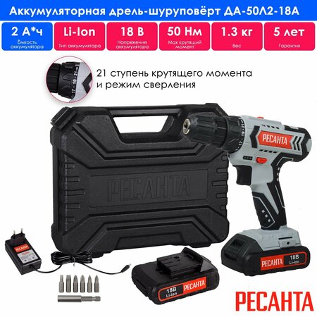 Дрель-шуруповерт Ресанта ДА-50Л2-18А имеет 2 аккумулятора емкостью 2 А*ч с напряжением 18 В. Щеточный тип двигателя обеспечивает высокую производительность с максимальным вращающим моментом 50/25 Нм. Быстрозажимной патрон диаметром 0,8-10 мм в сочетании с функцией блокировки шпинделя обеспечивает удобную замену оснастки. Аккумуляторные батареи типа Li-ion отличаются быстрой зарядкой в течение 60 мин. Наличие двух режимов работы со скоростью вращения 0-400 и 0-1400 об/мин позволяет подстраиваться под используемый в работе материал и его толщину. Максимальный диаметр отверстий для древесины составляет 30 мм, для металла - 12 мм. Дрель-шуруповерт Ресанта ДА-50Л2-18А может использоваться для бытовых ремонтно-строительных работ. Эргономичная конструкция с прорезиненной рукояткой позволяет надежно удерживать инструмент в руке. Малый вес 1,3 кг делает возможным использование устройства в течение долгого времени. Механизм реверса удобен для выкручивания шурупов и извлечения застрявшего сверла. Функция подсветки рабочей поверхности позволяет работать при низком уровне освещения. Аккумуляторы имеют слайдерный способ установки, что делает их замену проще и быстрее. Комплектация дополнена набором бит и адаптером-удлинителем. Удобный пластиковый кейс позволяет компактно и безопасно хранить и транспортировать инструмент.