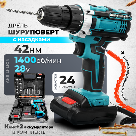 Шуруповерт аккумуляторный ударный, дрель-шуруповерт, набор инструментов в кейсе + перчатки