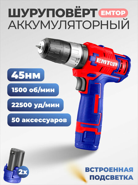 Аккумуляторный шуруповёрт EMTOP ECIDL12622 — компактный, мощный и многофункциональный помощник для дома, мастерской и стройки! Быстро справляется с заворачиванием, сверлением и ударной работой, а встроенная подсветка освещает рабочую зону даже в труднодоступных местах . Характеристики: