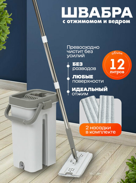 Швабра с отжимом и ведром для мытья полов и окон. Профессиональный набор для сухой и влажной уборки дома.