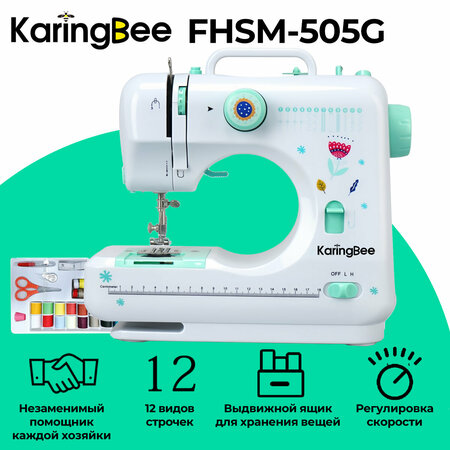 Швейная машина KaringBee FHSM-505G зеленый+набор аксессуаров, электрическая от сети, реверс, регулировка скорости, нитевдеватель и подсветка,12 видов строчек