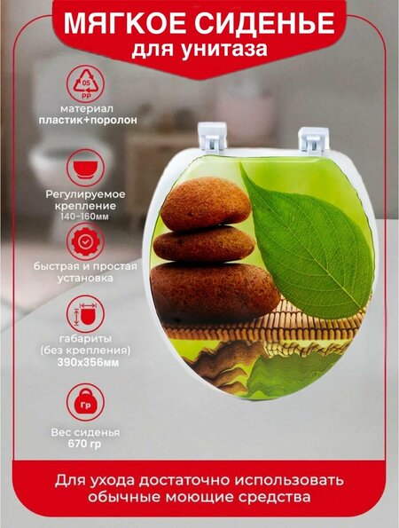 Хотите обновить интерьер в ванной комнате и добавить комфорта? Сиденье на унитаза мягкое Камешки с креплениями - идеальное решение! Это стильное и практичное сиденье для унитаза с крышкой не только улучшит внешний вид вашего туалета, но и обеспечит максимальный комфорт во время использования. Крышка для унитаза универсальная и подходит для большинства унитазов, что делает её удобным выбором для каждого дома. Мягкое сиденье стульчака обеспечит дополнительный комфорт во время использования унитаза, а прочные крепления гарантируют надежную фиксацию. Эта крышка унитаза легко устанавливается на любую модель унитаза (унитаз напольный классический, унитаз подвесной, туалет для дачи). Материал не вызывает аллергии и раздражения, поэтому подходит даже для маленьких детей. Стульчак для унитаза с крышкой сделан из высококачественных материалов, что гарантирует его прочность и долговечность. Камешки на крышке придают товару уникальный дизайн, который добавит шик вашей ванной комнате. Крепления позволяют быстро и легко произвести установку сиденья. Порадуйте себя и вашу семью стильным и удобным сиденьем для унитаза с камешками и креплениями! Технические характеристики: Длина 390 мм Ширина 356 мм Высота 50 мм Расстояние между креплениями 140-160 мм Длина винтов 100 мм Размер внутреннего овала сиденья 265х230 см Гарантия 2 года Страна производства Россия