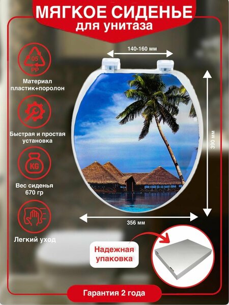 Хотите обновить интерьер в ванной комнате и добавить комфорта? Сиденье для унитаза мягкое Пляж с креплениями- идеальное решение! Это стильное и практичное сиденье для унитаза с крышкой не только улучшит внешний вид вашего туалета, но и обеспечит максимальный комфорт во время использования. Крышка для унитаза универсальная и подходит для большинства унитазов, что делает её удобным выбором для каждого дома. Мягкое сиденье стульчака обеспечит дополнительный комфорт во время использования унитаза, а прочные крепления гарантируют надежную фиксацию. Эта сидушка на унитаз легко устанавливается на любую модель унитаза (унитаз напольный классический, унитаз подвесной, туалет для дачи). Материал не вызывает аллергии и раздражения, поэтому подходит даже для маленьких детей. Мы учли пожелания клиентов, просивших заменить упаковку для данной модели сиденья на унитаз. Теперь сидушки будут приходить в обновленных коробках для того, чтобы товар доставляли до покупателя в полной комплектации и в надлежащем товарном виде! Стульчак для унитаза с крышкой сделан из высококачественных материалов, что гарантирует его прочность и долговечность. Пляж на крышке придает товару уникальный дизайн, который добавит шик вашей ванной комнате. Крепления позволяют быстро и легко произвести установку сиденья. Порадуйте себя и вашу семью стильным и удобным сиденьем для унитаза с креплениями! Технические характеристики: Длина 390 мм Ширина 356 мм Высота 50 мм Расстояние между креплениями 140-160 мм Длина винтов 100 мм Размер внутреннего овала сиденья 265х230 см Гарантия 2 года Страна производства Россия
