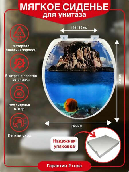 Хотите обновить интерьер в ванной комнате и добавить комфорта? Сиденье для унитаза мягкое Подводный Мир с креплениями- идеальное решение! Это стильное и практичное сиденье для унитаза с крышкой не только улучшит внешний вид вашего туалета, но и обеспечит максимальный комфорт во время использования. Крышка для унитаза универсальная и подходит для большинства унитазов, что делает её удобным выбором для каждого дома. Мягкое сиденье стульчака обеспечит дополнительный комфорт во время использования унитаза, а прочные крепления гарантируют надежную фиксацию. Эта сидушка на унитаз легко устанавливается на любую модель унитаза (унитаз напольный классический, унитаз подвесной, туалет для дачи). Материал не вызывает аллергии и раздражения, поэтому подходит даже для маленьких детей. Мы учли пожелания клиентов, просивших заменить упаковку для данной модели сиденья на унитаз. Теперь сидушки будут приходить в обновленных коробках для того, чтобы товар доставляли до покупателя в полной комплектации и в надлежащем товарном виде! Стульчак для унитаза с крышкой сделан из высококачественных материалов, что гарантирует его прочность и долговечность. Подводный Мир на крышке придает товару уникальный дизайн, который добавит шик вашей ванной комнате. Крепления позволяют быстро и легко произвести установку сиденья. Порадуйте себя и вашу семью стильным и удобным сиденьем для унитаза с креплениями! Технические характеристики: Длина 390 мм Ширина 356 мм Высота 50 мм Расстояние между креплениями 140-160 мм Длина винтов 100 мм Размер внутреннего овала сиденья 265х230 см Гарантия 2 года Страна производства Россия