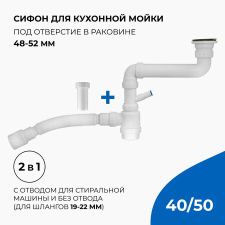 Сифон для кухонной мойки 2 в 1, 1.1/2"х40, с и без отвода для стиральной машины с гибким соединением 40х40/50