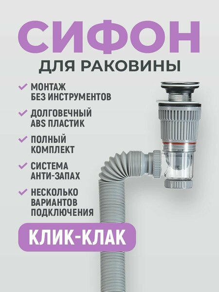 Универсальный сифон для раковины с донным клапаном с механизмом клик клак. Современное дополнение к сантехнике и удобное решение для каждого пользователя в процессе эксплуатации. Подходит для умывальника в ванной комнате, раковины или мойки на кухне. Изготовлен из высококачественных материалов, устойчивых к ежедневным большим нагрузкам. Клапан из нержавеющей стали с глянцевым покрытием годами сохраняет свой блеск и не подвержен коррозии. Сифон из ABS-пластика устойчив ко всем типам жидкости, в том числе к химическим средствам. Эластичная гофра труба длиной 90 см благодаря своей гибкости обеспечивает простое и быстрое подключение к водостоку. Система внутреннего слива оснащена обратным и запирающим клапаном, предотвращающий перелив воды из канализации в раковину. Такой водяной автоматический гидрозатвор полностью исключает неприятные запахи из слива, повышая ваш комфорт. Прозрачная пластиковая основа поможет контролировать состояние колбы на предмет засора, понимая где он произошел: под раковиной или в общем домовом стояке. Металлическая кнопка-затвор одним легким нажатием поможет обеспечить задержку или слив воды в раковине. Справится даже ребенок! При этом вся водная пластмассовая система с гофрированным шлангом выглядит эстетично и аккуратно. При необходимости полностью закрывается тумбой и занимает ограниченное пространство. Подходит под любой тип сантехники, накладные умывальники и раковины, обеспечивая долговечность и надежность.