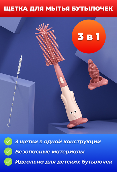 Многофункциональный набор щеток для мытья детских бутылочек, сосок, трубочек, поильников - главный помощник для каждой мамочки. В наборе 3 многоразовые щётки: для мытья бутылок, для мытья сосок, ершик для трубочек. Силиконовые щетки для мытья детской посуды удобны в использовании, эффективно чистят детскую посуду от смесей и соски в самых труднодоступных местах, не царапая их. Ершик для посуды можно использовать для мытья бокалов, термосов, узких ёмкостей, баночек для кормления. Моющая щетка подойдет для мытья посуды любой формы и с легкостью вычистит соску. Набор аксессуаров и ершиков для сосок, для бутылочек, для детской посуды термоустойчив, можно стерилизовать. Щетка с насадками для мытья поильников легко отмоет дно и стенки бутылочки. Гипоаллергенный материал не навредит здоровью. Подходящее решение для сохранения гигиены. Набор удобно и компактно хранить в подставке. Принадлежности для мытья детской посуды - практичный, долговечный набор, в отличие от обычных щеток, губок. Полезный подарок для молодой семьи, мамы, папы, будущих родителей и их новорожденных малышей.