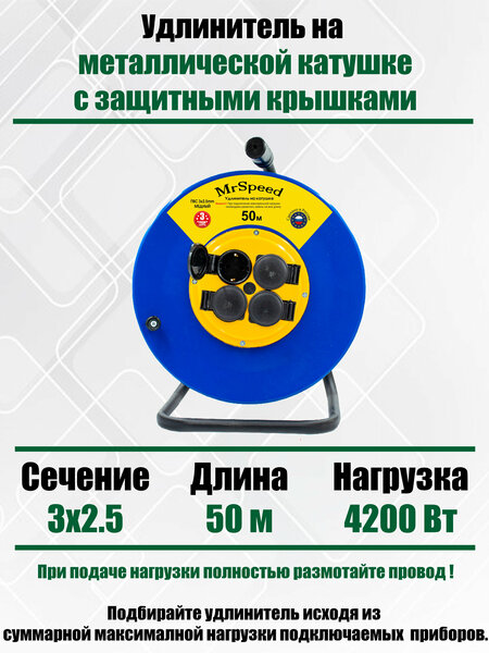 Удлинитель силовой на металлической катушке c защитными крышками MrSpeed с заземлением. Силовой провод : ПВС 3х2.5м2 4 розетки. Металлическая катушка Длина провода: 50м. Мощность 16А/4200Вт. Используется для работы на строительных площадках или дачных участках. Удобен при работе с приборами находящимися удаленно от стационарной розетки. Например газонокосилки, электрические пилы, триммеры или электродрели. Внимание! Перед использованием удлинителя необходимо размотать провод на ВСЮ длину во избежании нагрева кабеля И последующем замыкании!
