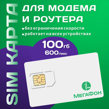 Уважаемый покупатель! Вот что мы Вам предлагаем: Сим карта для модема с непубличным, выгодным тарифом. Идеально подходит для пользователей смартфонов, планшетов, для USB модема, wi-fi роутера, фото ловушек, IP-камер системы видеонаблюдения, навигатора, смарт-часов и автомагнитол. Объём трафика интернета 100 ГБ в 3G, 4G, LTE диапазонах. Наша сим карта для интернета, с тарифом для модема-это гарантированная раздача на неограниченное количество устройств. Расход интернета можно всегда посмотреть в личном кабинете. Тариф действует по всей России, кроме Крыма, Севастополя, Чукотского АО, Камчатского края, Магаданской и Сахалинской областей. Абонентская плата 600 рублей в месяц. ВАЖНО! Внимание! SIM-карты регистрируются строго по паспорту, согласно федеральному закону (ФЗ-126). Не оформленные номера блокируют. Наш оператор подскажет, как всё сделать корректно. Правильно оформив номер, вы гарантировано сможете восстановить чип sim при его утере. При активации оператор единоразово списывает с баланса 100 рублей. Далее списание платежа происходит каждый месяц в дату активации тарифа. Уважаемые покупатели! ВАЖНО ЗНАТЬ! В личном кабинете на данном тарифе абонентская плата 1200 р, не спешите делать негативные выводы. На данном тарифе действует постоянная скидка 50%, которая не отображается в личном кабинете. Воспользовавшись тарифом Вы убедитесь в этом! Установите симку в смартфон. Включите его. После появления сети подождать пару минут и можно пользоваться. Удобнее всего активировать в смартфоне. Важно! Во избежание рисков, связанных с мошенничеством, не размещайте в Ваших отзывах и вопросах фотографии с серийным и мобильным номером на пластике.