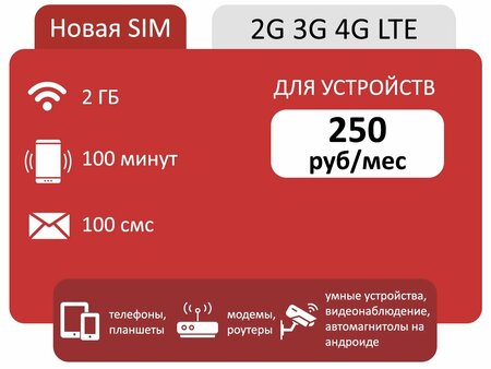 Интернет - 2гб Звонки - 100 мин Смс - 100 шт Данный тариф оптимален для устройств с отдельным слотом для sim-карт и с небольшим потреблением интернета. Например: smart-часы для ребенка в школу, SOS-кнопки для пожилых, сигнализации и шлагбаумы на даче, газовые котлы в частных домах, GSM-устройства для умного дома. Так же подходит для модема, роутера, планшета, автомагнитол на андройде. Первоначально при активации единоразово оператор спишет 150 руб за пластик. Личный кабинет от оператора.