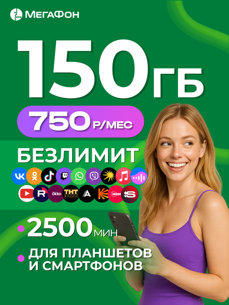 Сим-карта МегаФон 150 Гб и 2500 мин, для любых устройств, безлимитный доступ к интернету Тариф от МегаФон, включающий 150 Гб трафика для любого устройства в сетях МегаФон, 2500 минут, 150 смс за 750 рублей. Вы выбираете на свой вкус! Данный тариф подходит для смартфонов и планшетов. Услуга предоставляется без ограничений на раздачу интернета другим устройствам и не требует дополнительной оплаты. Первый месяц списание абонентской посуточно, начиная со второго месяца помесячно. Активация стоит 50 рублей. Особенности тарифа: Безлимитные соцсети, мессенджеры, музыка, кинотеатры и видео. Доступ к мобильному интернету. Поддерживается официальная регистрация сим-карт через приложение или веб-сайт оператора. Простое подключение и возможность работы на всей территории России. Отсутствие роуминга по всей стране. Регистрация возможна только гражданам РФ через портал Госуслуг. Таким образом, тариф представляет собой экономичное решение для тех, кто активно пользуется мобильным интернетом и нуждается в стабильном доступе вне зависимости от региона пребывания.