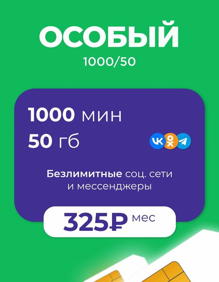 Сим-карта Мегафон с тарифом "Особый" – отличное решение для связи и интернета! Абонентская плата: 325 рублей в месяц. Пакет услуг: 1000 минут звонков по всей России и 50 ГБ интернета. Безлимитный доступ к мессенджерам и социальным сетям. Работает в сетях 3G, 4G, LTE и Pre 5G. Поддерживает eSIM. Покрытие: вся Россия, кроме Республики Крым, Севастополя, а также с ограничениями на территории Чукотского АО, г. Норильска и Таймырского МР. Согласно закону "О связи", регистрация сим-карты осуществляется по паспорту РФ для граждан старше 14 лет. Подробная инструкция по регистрации и активации прилагается в комплекте.