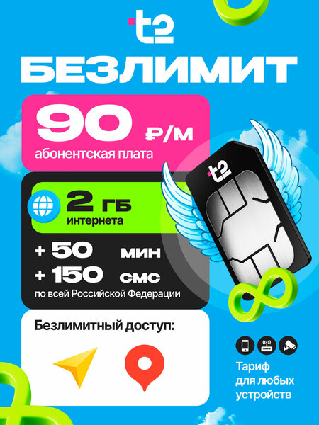 SIM-карта с тарифом 2 гб интернета 3G/4G/LTE + 50 мин + 150 смс для смартфонов, модемов, роутеров, планшетов за 90 руб/мес + в тариф включена раздача • 2 Гб - 90 ₽/мес • 50 мин по всей России • 150 смс по всей России • Раздача Wi-Fi включена в тариф, дополнительно ничего списываться не будет! • Сим-карта работает в модемах, роутерах, смартфонах, планшетах без необходимости прошивки! • Безлимит на Яндекс Карты и Навигатор • Для активации нужно пополнить баланс на 140 руб. И сим-карта активируется. Для активации SIM-карты необходимо: • Скачать приложение (следуя инструкции) в Google Play, App Store, App Gallery или Ru Store; • Выбрать пункт "Стать абонентом"; • Нажать "Активировать SIM-карту"; • Отсканировать штрих-код sim-карты или ввести данные вручную. Выбрать способ идентификации. Для новых абонентов потребуется подтверждённый аккаунт на Госуслугах и Госключ. Самостоятельная регистрация SIM-карты возможна только для граждан РФ. Уважаемый абонент! Если процесс активации вызвал у вас затруднения, то для оперативного решения вопроса обращайтесь на выделенную линию технической поддержки: 8 800 200 61 15 (звонок бесплатный) При отсутствии на счете полной суммы для списания тариф блокируется до тех пор, пока баланс не будет пополнен до необходимой суммы. В случае неоплаты тарифа в течении более чем 180 дней, номер блокируется оператором автоматически. Вводится плата за подключение SIM-карты с 20 октября, 50 руб. При получении сим-карты, необходимо пополнить счет на сумму равную стоимости тарифа + 50 руб. Согласно ФЗ 126 "О связи" от 07.07.2003 регистрация СИМ-карты производится строго на паспортные данные абонента. Вместе с SIM-картой прилагается инструкция по регистрации и активации через портал "Госуслуги". *Данный тариф не работает на территории Республики Дагестан.