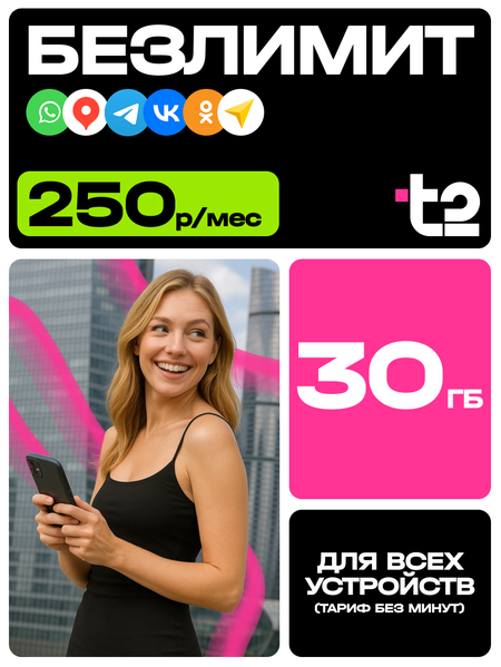Сим карта от Т2 с тарифом, включающим 30 ГБ интернета за 250 рублей в месяц. Данный тариф от теле2 подходит для различных устройств — смартфонов, планшетов, модемов, роутеров, автомобильных видеорегистраторов. Услуга предоставляется без ограничений на раздачу интернета другим устройствам и не требует дополнительной оплаты. Без минут. Особенности тарифа: Доступ к мобильному интернету, а также 60 SMS. Поддерживается официальная регистрация sim-карт через приложение или веб-сайт оператора. Сим карта также предназначена специально для роутеров, модемов, планшетов и иных устройств. Простое подключение и возможность работы на всей территории России. Отсутствие роуминга по всей стране. Перед покупкой проверьте карту покрытия Т2 на работоспособность сим карты в вашем населенном пункте. В Башкортостане у Т2 нет покрытия. Включены дополнительные опции: Безлимит на использование картографических сервисов и навигационных приложений, мессенджеров и видео. Регистрация возможна только гражданам РФ через портал Госуслуг. Таким образом, тариф от теле 2 представляет собой экономичное решение для тех, кто активно пользуется мобильным интернетом и нуждается в стабильном доступе вне зависимости от региона пребывания. Выбирайте команду SIMTOP!