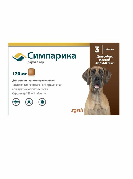 относится к группе инсектоакарицидных препаратов системного действия; действующее вещество - саролaнep, вспомогательные вещества: лактозы моногидрат, натрия карбоксиметил крахмал, кремния диоксид коллоидный, магния стеарат и вкусоароматическая гранулированная основа; после перорального введения препарата сароланер быстро всасывается в желудочно-кишечном тракте (биодоступность составляет >85 %), поступает в системный кровоток, достигая максимальной концентрации в плазме менее чем через 3 часа, проникает в большинство органов и тканей, практически не метаболизируется, выводится из организма в неизмененной форме, преимущественно с желчью и фекалиями, период полувыведения составляет 10- 12 суток; препарат вызывает гибель блох, паразитирующих на собаке, не позже, чем через 3 часа, а иксодовых клещей — не позже, чем через 8 часов после введения лекарственного препарата; гибель блох происходит до откладки яиц, что профилактирует контаминацию помещений яйцами и личинками; Симпарика снижает риск передачи возбудителей бабезиоза (Babesia canis), болезни Лайма (Borrelia burgdorferi) и анаплазмоза (Anaplasma phagocytophilum), вследствие уничтожения иксодовых клещей до передачи возбудителей вышеуказанных болезней