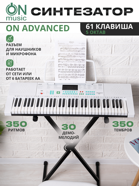 Внимание! Стойка под синтезатор в комплект не входит, вы можете приобрести ее отдельно: арт. 51029364013, арт. 51029368433! А так же данная комплектация синтезатора не предусматривает наличие микрофона! Оригинальный синтезатор ON Advanced имеет клавиатуру из 61 клавиши, что соответствует широкому диапазону 5-ти октав. Синтезатор предоставляет широкий спектр возможностей, как для начинающих музыкантов, так и для тех, кто использует музыкальный инструмент для души, но хотел бы сэкономить на покупке. Главная функция в этой модели-наличие обучения на нескольких уровнях. Это позволяет понять основы игры, легко овладев начальными навыками. Удобная панель управления, богатый набор из 260ти ритмов, 419ти тембров, 30ти демо-мелодий, 2х эффектов: сустейн и вибрато. Эти дополнения помогут Вам сочинить интересную мелодию, а функция записи сможет ее сохранить во внутреннюю память устройства для последующего прослушивания. Разъем для наушников позволит заниматься музыкой в любое время суток. Легкий и компактный дизайн, а также работа от 6 батареек типа АА сделает любую переноску простой и удобной, что позволит Вам заниматься любимым делом без каких-либо ограничений.