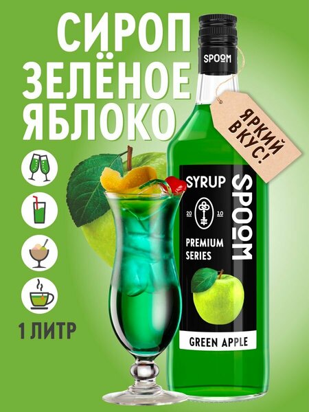 Сироп Spoom «Зеленое яблоко» обладает насыщенным свежим ароматом душистых зеленых яблок. Аппетитная густая консистенция окрашена в ярко-зеленый красивый цвет. Изысканные нотки кисло-сладкого зеленого яблока во вкусе поразят и приятно удивят самых утонченных гурманов. Очень эффектно будет смотреться в слоеных коктейлях и подарит незабываемые вкусовые нюансы алкогольным и безалкогольным коктейлям. Также его добавляют в холодный чай, лимонад и компот. Им можно поливать мороженое, фруктовые салаты, торты, пирожные и выпечку. Каждое блюдо заиграет новыми свежими тонами зеленого яблока.