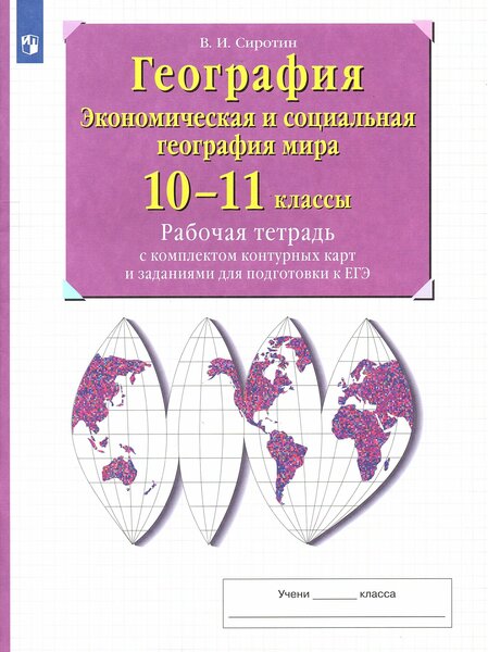 Сиротин В. И. География 10-11 класс. Экономическая и социальная география мира. Рабочая тетрадь с контурными картами (с тестовыми заданиями ЕГЭ) Сиротин География 10 класс Рабочая тетрадь представляет материал учебной программы по географии для 10 класса в виде системы разнообразных заданий, которые помогут учащимся сформировать умения и навыки практической работы с учебником, атласом, контурной картой, а также подготовиться к сдаче ЕГЭ. География 10 класс Рабочая тетрадь может быть использована на уроках, при проведении учебных экскурсий и дома для самостоятельной работы. Специальными знаками отмечены задания, направленные на формирование метапредметных умений (планировать деятельность, выделять различные признаки, сравнивать, классифицировать и др.) и личностных качеств учеников.