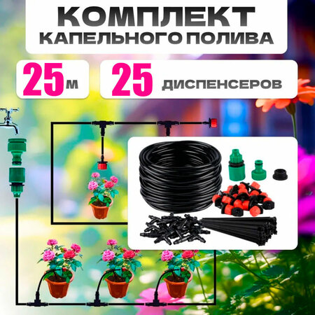 Трубка ПВХ 25 м; регулируемые капельницы 25 шт; Т-образный переходник 25 шт; стойка-колышек для крепления микротрубки 25 шт; переходник для микротрубки 1 шт; набор хомутов для фиксации трубки.