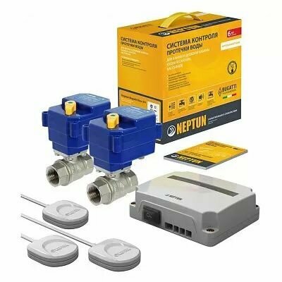 истема контроля протечки воды Neptun Вugatti Base предназначена для своевременного обнаружения и локализации протечек воды в системе водоснабжения и отопления жилых домов, коттеджей, офисных зданий, магазинов. Система заблокирует подачу воды до устранения причин протечки и проинформирует о возникшей аварии звуковым и световым сигналами. Neptun Bugatti Base - это лучшее соотношение цены и качества. Модуль управления Neptun Base - простое, но при этом очень надежное устройство. Дополнительных функций не много, но если они Вам и не нужны, то это идеальное решение. Главное, что в комплекте идут зарекомендовавшие себя шаровые краны Neptun Bugatti, которые едут напрямую с завода в Италии. У электропривода большое усилие (ломает карандаши), которое никогда не будет лишним с учетом не очень качественной водоподготовки в России, в кране используются самые лучшие уплотнительные материалы (первичный фторопласт, который выдерживает даже серную кислоту) и конечно же - есть ручное аварийное открывание на случай, если не будет питания или электроника выйдет из строя. Система среднего ценового сегмента с оптимальной комплектацией. В состав входят краны итальянской фирмы Вugatti и российские компоненты (модуль и датчики). Комплектация: Модуль управления Neptun Base-1шт Датчик контроля протечки воды SW005-3 шт, длина 2 метра (возможно нарастить до 100 м.) Кран шаровый с электроприводом серии Neptun Bugatti Pro 220В-2шт