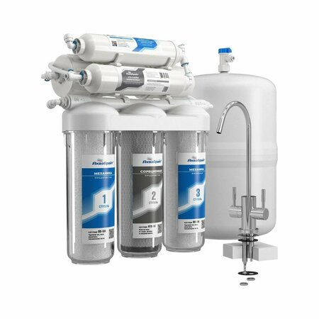 АБФ-ОСМО-6 Система очистки воды с обратноосмотической мембраной предназначена для очистки холодной воды от хлорорганических соединений, железа, пестицидов, тяжелых металлов, бактерий и вирусов. Очищенная вода предназначена для питья, приготовления пищи и т. п. Картриджи в комплекте: 1-я ступень ПП-5M механическая очистка 2-я ступень УГП-10 сорбционная очистка 3-я ступень ПП-1M механическая очистка 4-я ступень обратноосмотическая мембрана 5-я ступень финишная очистка (уголь) 6-я ступень минерализация воды