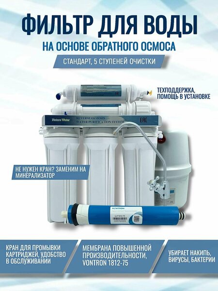 В случае возникновения трудностей при монтаже, появлении протечек и т. п, просим связываться с нашей технической поддержкой по тел. и WhatsApp: 8 (977) 857-83-77. _________________________________________ В карточке товара вы найдёте подробную видеоинструкцию по монтажу. _________________________________________ В нашем магазине также представлены системы различной комплектации: 1. Система обратного осмоса с Минерализатором, код товара: 3253419401. 2. Система обратного осмоса с Насосом, код товара: 3121812457. _________________________________________ Если к системе Стандарт дополнительно требуется установить минерализатор или насос, сообщаем коды: 1. Минерализатор, код товара: 3121812489 (на карточке с минерализатором есть видеоинструкция как его дополнительно установить). 2. Крепления, код товара: 3264516813. 3. Фитинг угловой (при необходимости), код товара: 3311964301. 4. Насос, код товара: 3312746738. _________________________________________ Если к системе дополнительно требуется установить защиту от протечек, код товара: 1747461765. _________________________________________ Коды сменных картриджей к пятиступенчатой системе обратного осмоса (фильтру): 1. Сменные фильтры, комплект картриджей "Стандарт 3". Код товара: 3121812542. 2. Сменные фильтры, комплект картриджей "Стандарт 3+постфильтр". Код товара: 31218125126. 3. Сменные фильтры, комплект картриджей "Стандарт 3+постфильтр и минерализатор". Код товара: 3121812513. 4. Сменные фильтры, комплект картриджей "Стандарт 5" с мембраной 1812-75. Код товара: 4241097166. 5. Сменные фильтры, комплект картриджей "Стандарт 5 годовой" с мембраной 1812-75. Код товара: 4242764744. _________________________________________ Запчасти и расходные материалы к системе Стандарт: 1. Четырехходовой клапан отсечной, код товара: 3331709401. 2. Обратный клапан угловой (трубка 1/4"- наруж. резьба 1/8"), код товара: 3253426142. 3. Ограничитель потока 300 мл, код товара: 3253419722. 4. Набор: обратный клапан (Угловой), четырехходовой отсечной клапан, ограничитель потока 300 мл (регулятор дренажа), код товара: 3264516736. _________________________________________ Система обратного осмоса NatureWater Стандарт — фильтр для воды, который используется для очистки водопроводной воды от различных типов загрязнений. -органические соединения разного типа; -окисленное железо; -хлор, пестициды, бензольные соединения; -радиоактивные вещества и тяжелые металлы; -растворимые соли; -неприятный запах воды. _________________________________________ Описание и применение системы обратного осмоса NatureWater: Пятиступенчатая система обратного осмоса NatureWater работает по принципу проникновения молекул сквозь тонкопленочную полупроницаемую мембрану с порами 0,0001 микрон под давлением. В процессе обратного осмоса происходит отделение молекул воды от всех остальных примесей и загрязнений, после чего на выходе получается полностью чистая вода. Чтобы сделать воду более полезной и насытить её минералами, используется минерализатор или биокерамический фильтр, как опция или в других моделях. _________________________________________ Система обратного осмоса NatureWater устанавливается под мойку, а вода подается через кран, установленный на раковине или столешнице. _________________________________________ Ступени очистки системой обратного осмоса: 1-я Ступень - Фильтр механической очистки Картридж изготовлен на основе полипропилена высокой плотности. Удаляет из воды окисленное железо (ржавчину), частицы ила, глины, песка, микроорганизмы, волокна торфа и прочие примеси органического и неорганического происхождения. 2-я Ступень - Гранулированный уголь Картр