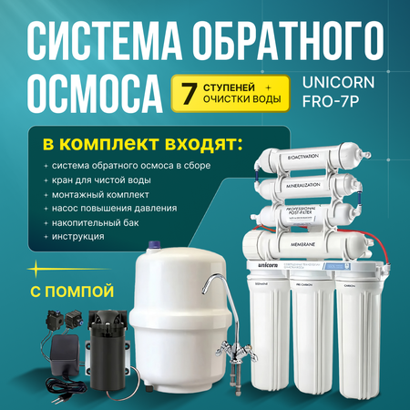 Cистема обратного осмоса с 7 ступенями очистки воды Unicorn FRO-7 c постфильтром и отдельным краном на мойку, картриджами, комплектом подключения к водопроводу и баком. Система очистки предназначена для получения воды наивысшего качества. Несколько ступеней очистки, включая обратноосмотическую мембрану, позволяют удалить до 99% всех видов загрязнений, включая бактерии и вирусы. Очищенная вода накапливается в отдельном баке и подается через кран, отдельно устанавливаемый на кухонной мойке. 1 ступень очистки: Механическая очистка. Устраняет нерастворенные в воде загрязнения механического типа, продлевая срок службы других картриджей. Ресурс - 12000 литров, срок службы - до 6 месяцев. 2 и 3 ступени очистки: Угольная очистка. Устраняет хлор и другие органические загрязнения. Ресурс - 5000-8000 литров, срок службы - до 6 месяцев. 4 ступень очистки: Обратноосмотическая мембрана. Устраняет до 96-99% загрязнений всех типов, в том числе бактерии и вирусы. Срок службы - до 3 лет. 5 ступень очистки: Угольная очистка. Устраняет летучие субстанции и придает вкус натуральной родниковой воды. Ресурс - 6000 литров, срок службы - до 12 месяцев. 6 ступень очистки: Биокерамическая активация воды. Активирует кластеры воды и делает ее биологически активной, восстанавливая природную структуру воды. Ресурс - 3600 литров, срок службы - до 12 месяцев. Главные свойства биоактивированной воды: удаление жиров, химических субстанций и токсинов из системы кровообращения; улучшение деятельности нервной системы; снижение уровня кислотности организма; повышение уровня кислорода; очищение организма. 7 ступень очистки: Минерализация воды. Обогащает воду необходимыми человеческому организму минералами и микроэлементами. Ресурс- 3600 литров, срок службы - до 12 месяцев. Подготовленная таким образом вода хранится в накопительном баке, откуда поступает к отдельному крану на кухонной мойке. Объем накопительного бака – 8 литров. В комплект также входят отдельный кран на кухонную мойку и комплект картриджей. В комплект системы входит насос повышения давления – для обеспечения стабильного давления в системе и ее бесперебойной работы.